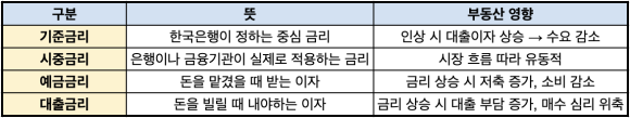 아래 표는 금리의 종류별 뜻과 부동산 시장에 어떤 영향을 미치는지를 정리한 것입니다.